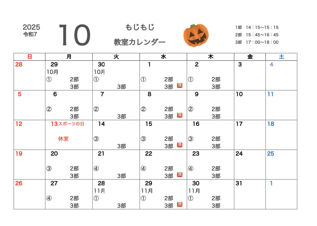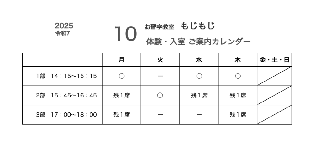 【2025年10月】習字教室もじもじ 体験・入室/教室カレンダー