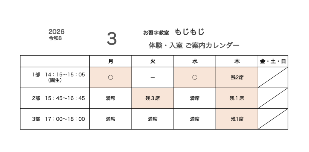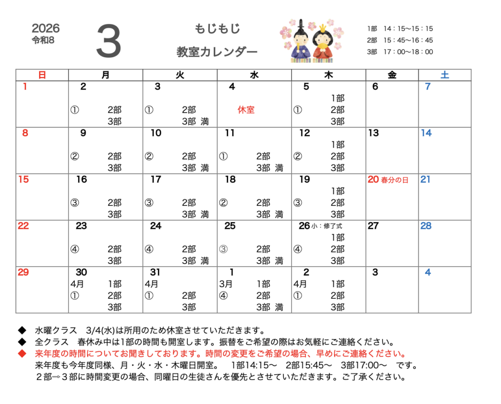 もじもじに通ってくださっている生徒さんへ、教室カレンダーをお知らせいたします!