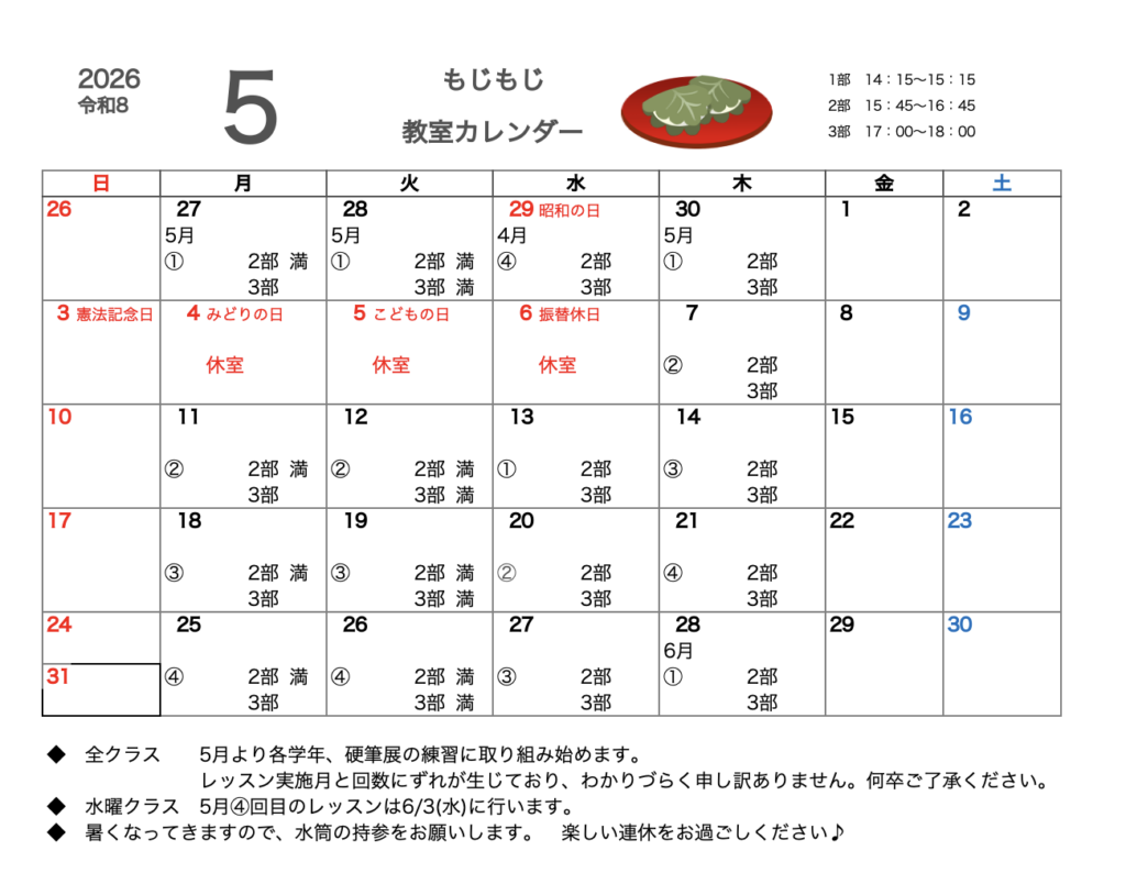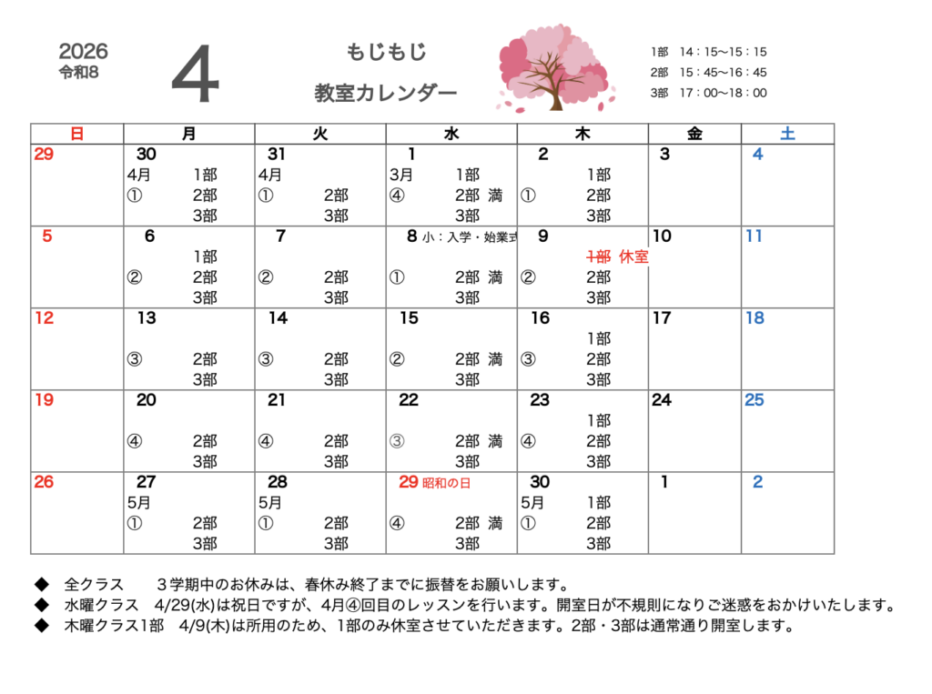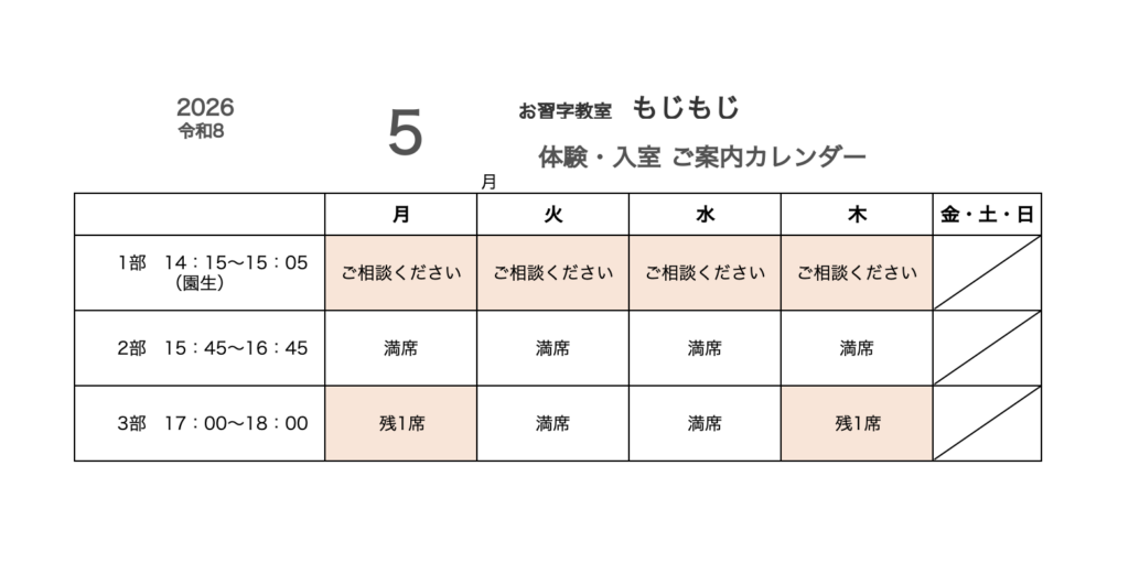 もじもじに通ってくださっている生徒さんへ、教室カレンダーをお知らせいたします!